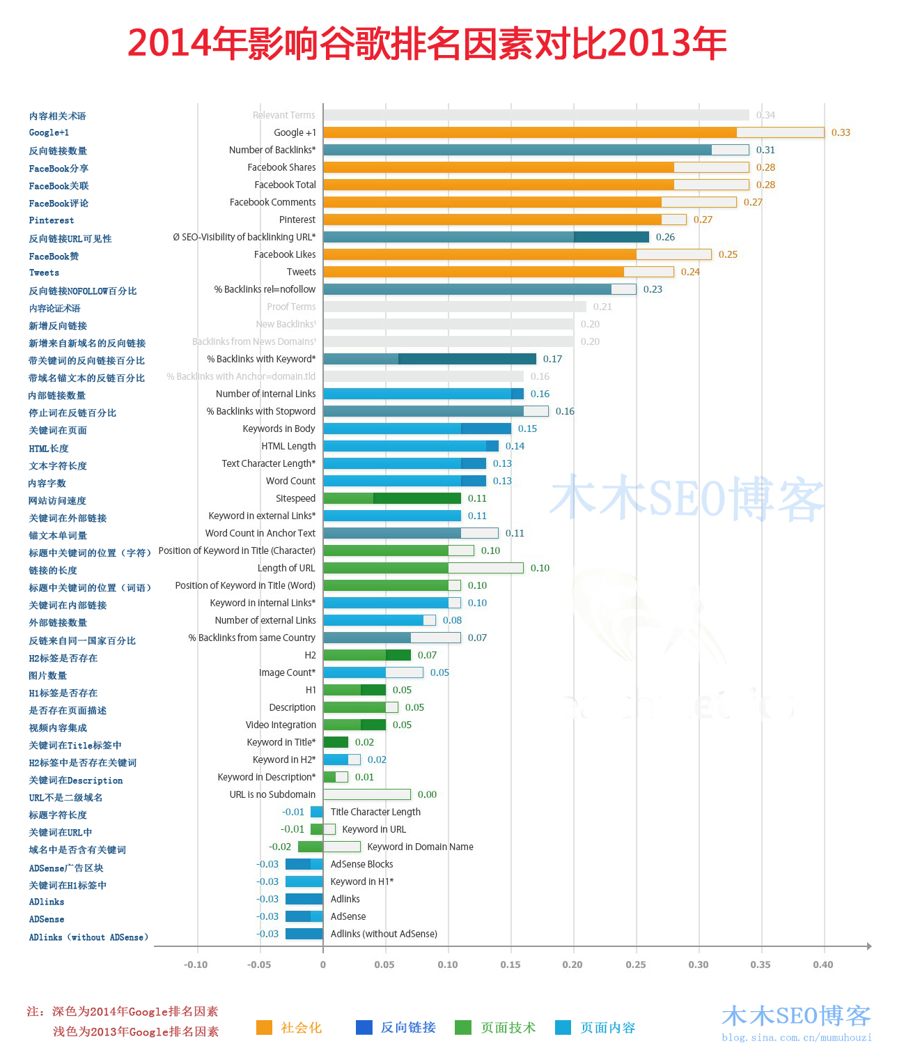 下面是2014年影響谷歌排名因素和2013年的對比,本來不打算再編譯的,不過還是有人問,我就再編譯了一下。