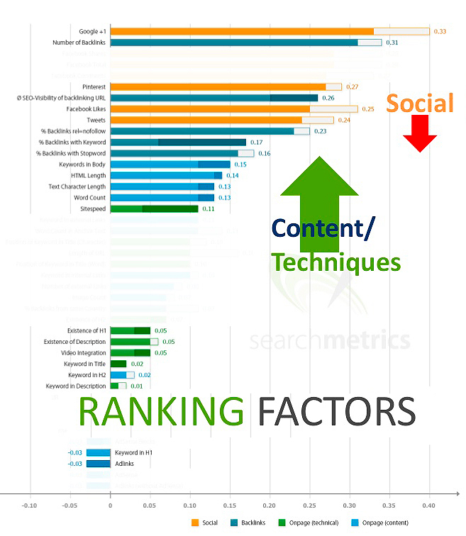 總體而言,2014年影響谷歌上網站排名的因素在社交媒體因素上整體有下降的趨勢,頁面內容和頁面技術因素都有明顯提升,特別是排在前面的一些因素。而反向鏈接因素方面,鏈接數量因素在減弱,而鏈接質量方面的因素在增強。關鍵詞在鏈接、在H標簽、在域名的價值都在減弱,而相關性、廣泛性和質量等因素在不斷加強,特別的,還新增了一些有關內容外鏈質量的因素。