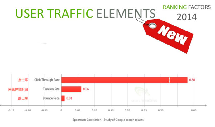 2014用戶行為更多的參與到排名,就跟之前說的一樣,網站投票轉為用戶投票。可以看到點擊率、網站停留時間、網站跳出率不僅擠進這些排名因素,而且網站點擊率這一項直接高達0.58,是目前已知的最高的,可以谷歌搜索引擎對用戶投票的重視程度。