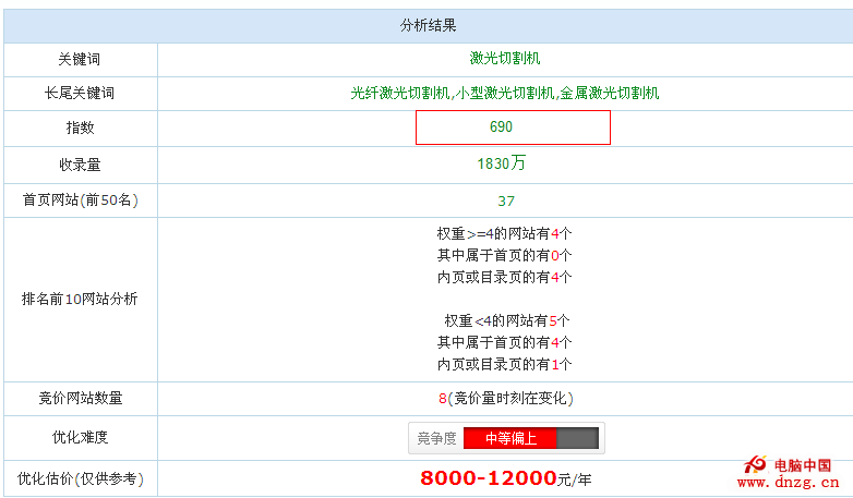 2.信息型的關鍵詞:這類型的關鍵詞可以用欄目或者內頁來優化,這類型的關鍵詞是屬於信息型的,搜索這類型的用戶大多數想了解激光切割機產品的類型之類的信息。信息型關鍵詞的競爭度也相對較低,而欄目頁的權重僅次於首頁,所以選擇欄目頁進行優化這類型的長尾關鍵詞是最有效果的。
