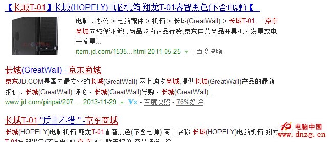 在用戶評論時,京東商城會有個簡短總結性的評論標題,京東把部分適合如此操作商品的每條評論都做了一個單獨的頁面,在商品評論列表中單擊“評論標題”即可進入,這個單獨頁面的Title設計為“商品名‘評論標題’.京東品牌名”,這樣每條用戶評論都為京東貢獻了圍繞該商品的長尾信息型關鍵詞和內容。由於用戶引導方面做得很好,因此這些評論的獨立頁面質量都很不錯,宏觀來看頁面Title設置也非常給力。如圖所示為京東商城中商品“長城T-01”的評論被百度收錄的情況,強大的用戶自然地為京東商城貢獻了大量“長城T-01”相關的信息型長尾詞,並配備了相應的內容。相信這部分頁面也為京東商城貢獻了不菲的搜索流量。