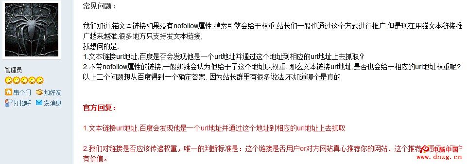 百度官方在《談外鏈判斷》及其他多個場合都表示過,一個鏈接是否傳遞權重,都是以該鏈接是否有真正的推薦意義為判斷依據。如圖所示為百度搜索工程師在“百度站長社區”中的相關回應:“我們對鏈接是否應該傳遞權重,唯一的判斷標准是,這個鏈接是否是用戶 or對方網站真心推薦你的網站、這個推薦是否對用戶有價值。”