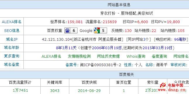 穿衣打扮是一個做女性服飾的淘寶客網站,專為女性提供服飾搭配、美容知識等方面的精彩文章,每天更新。現在百度權重6,谷歌PR5,日均PV達到19800,站長工具關鍵詞詞庫擁有3043個關鍵詞。