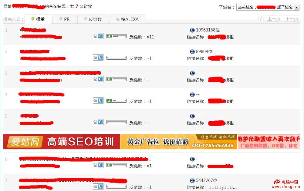 思考三:通過某站長工具查看網站反鏈輸入網站域名,結果出來了,共有7條鏈接指向這個英文網站,再看鏈接的名稱,原來就是此中文關鍵詞,所有都是鏈接網站首頁。