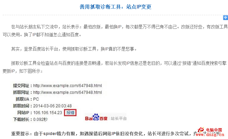 從中我們也可以看到其實這個技巧很簡單,就如官方內容裡面所說的利用網頁抓取工具抓取我們更換IP網站中的一個頁面,然後對其進行抓取測試,結果會顯示出來一些基本的信息,比如模擬抓取的訪問設備、時間、IP地址、加載時間等,而這個時候發現IP地址還是之前舊的就說明搜索引擎還未識別到我們新的IP,這時候我們在這裡點擊報錯然後提交告訴搜索引擎我們的網站已經更換IP了,你訪問原來的訪問不到不是因為我們的網站不存在了,你來我們新的地方來抓取吧,也就是提高了搜索引擎對網站更換IP的響應時間。