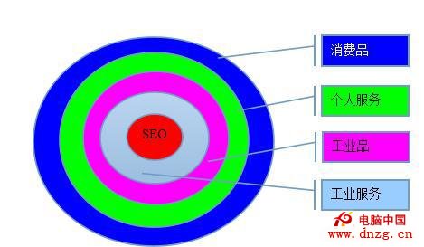 根據我的觀察,以上三類客戶對於SEO的態度、走向以及依賴程度也是不同的。工業品企業在營銷上,實際上是線上和線上雙線發展,而在線上營銷中,對於搜索引擎優化和B2B平台同樣看重。消費品企業對於SEO的依賴程度正在不斷降低,主要是受到電商發展的影響,比起SEO,很多的消費品企業偏向於自建網上商城或者入駐電商平台,實際上,他們在搜索引擎優化方面的投資是逐年降低。生活服務類產品,這些企業包括提供個人或者家庭生活需要的服務,例如招聘網站、保姆雇傭、家庭搬家清潔等等。因為不少用戶依然習慣於通過搜索引擎來尋找這類生活服務,所以,這些企業的很大一部分訂單都是通過搜索獲得的,他們對於SEO較為依賴。還有就是工業服務類企業,包括設備搬家公司、工廠搬遷、企業咨詢、財務會計、資金信貸等等,這類企業主要是為企業提供服務。為企業提供服務的行業類別也很多,越是競爭激烈的行業,對於SEO的依賴性越強。不同客戶群體對於SEO的依賴程度如下圖所示,越是處於核心位置,對於SEO的依賴性越強。