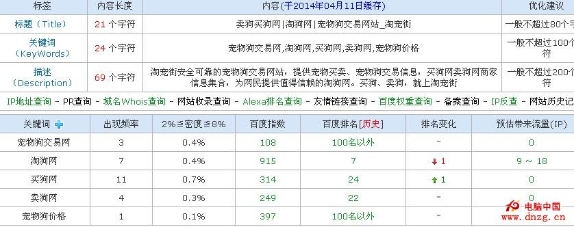 我們再看看網站的標題,關鍵詞和描述,這個也是網站首頁的重要組成部分,從圖中看出,網站指數還是比較高的,我們一般做的詞大部分都在一百左右,關鍵詞的密度最好應該是在3%-8%,但這個密度調整真正操作起來還是有些困難的,我們可以從圖中看到這裡的關鍵詞密度還是比較低的,說明這方面還有很大的空間來提升網站關鍵詞的排名。www.dnzg.cn