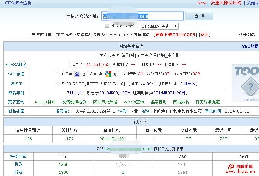 本文的案例是一個叫做寵物街的網站,我們通過站長工具可以看到這個網站的大部分具體的信息,這裡主要選擇幾個重點的信息觀察下即可,我們可以從站長工具中看到的信息如下:網站要做的詞:主關鍵詞為寵物狗交易,7個月的時間網站權重達到2,說明百度還是比較認可這個網站,此站的站長也為這個網站花費了不少的精力做內容的原創,我們從反鏈數量中就可以看出,網站的域名IP,顯示的是北京的萬網的機房,做網站的都知道,萬網目前是國內最好的頂級注冊商,速度也是非常的快的,這給網站的解析,用戶體驗增色不少,另外,網站快照為最新,我們從百度快照中可以看到百度對本網站的抓取率還是比較高的,收錄的數量達到1560,當然這只是一個參考,最准確的收錄量最好通過百度站長工具看網站的索引量。
