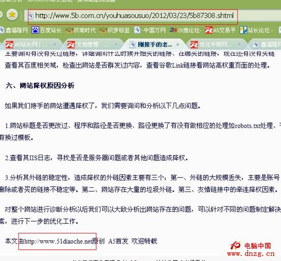 有很多人認為純文本的網址做外鏈是沒有作用的,對網站是沒有貢獻值的,其實是錯誤的,自從百度站長平台推出外鏈查詢功能,我們做外鏈的針對性就更加強了,我們能知道哪一些外鏈是能夠被百度識別並計算權重的,當你在A5平台上發表一定數量的文章的時候,會有大批的網站、博客去轉載、采集你的文章,因為文章中有你留在底部的網址,他們在轉載的時候就會給你加了一條外鏈,這樣的自由傳播外鏈是能夠被百度識別並計算的。(如圖)我在A5發的一篇文章被某網站采集過去並留有我的網址
