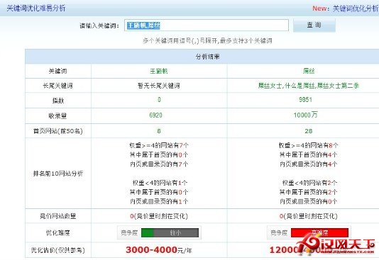 很多網絡公司或者站長論壇都出現了在線關鍵詞報價系統,王施帆基本上都測試過,感覺最好、最值得推薦的還是站長工具上面的。它相比較我們人為報價結果非常靠近,而且它的信息面比其他在線工具要全,列舉了圍繞關鍵詞的長尾關鍵詞、指數、收錄量、首頁網站個數、排名前十網站的分析、競價網站數量以及優化難度。
