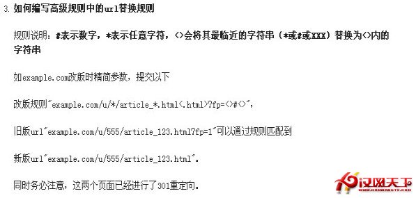 另一種就是比更換域名更復雜的改版,比如目錄級別大量鏈接進行跳轉等就需要提交高級規則了,具體規則怎麼提交,也可以看看下圖官方所說的方法吧。