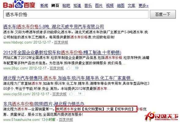 通 過我們對灑水車行業的充分了解,客戶對灑水車購置稅問題非常關注,並且很多用戶都是急切地要購買,所以我們在標題中突出我們的灑水車免交購置稅,並隨時有 現車供應,這就讓我們網站獲得了更多用戶的關注,此灑水車網站雖然只上線一個月,但灑水車價格就排名第四,後續應該排名更好。所以我們應該展示出我們特有的優勢,讓用戶相信我們的產品最符合它的需求,這就需要我們進行標新立異,如競爭對手都突出價格,那麼我們就不要在價格上與之競爭,我們可以突出我們的質量,這樣才能吸引用戶眼球的聚焦,引導用戶點擊。