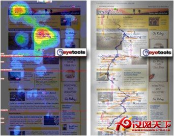 兩個圖片都顯示:網頁閱讀模式是非線性的。右下方的路徑圖顯示了用戶浏覽一個網頁的視線軌跡。
