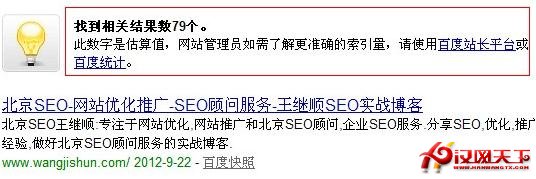 從上面的截圖可以看出,使用site命令查詢的百度收錄量為79個。同時,百度也在告訴大家:此數字是估算值,網站管理員如需了解更准確的索引量,請使用百度站長平台或百度統計。
