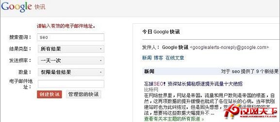 谷歌快訊是個人比較喜歡的一個SEO信息查詢工具,只要填上想監控或關注的關鍵詞,谷歌會自動通知你與這個關鍵詞相關的最新內容,包括:博客、視頻、新聞、討論、圖書等類型。當你設定發送頻率和數量,然後在“發送到:”這裡填上自己的郵箱,就可以收到今日谷歌快訊了。