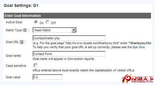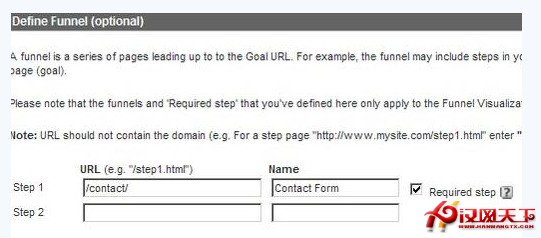 一旦我們建立了目標(見下圖),我們將要求所有關目標URL(比如網址的最後一頁,上面寫著感謝您的購買,或下載或與我們聯系)擁有一個可選部分,被稱為“定義漏斗”,它可以讓我們指定我們要跟蹤訪問者的路徑。例如,如果一個訪問者在購買我們電子商務網站的產品,我們可能要跟蹤產品的登陸頁面,購物車頁面,付款頁面,並銷售確認頁,找出其中大多數游客放棄他們購物體驗的原因。因此,我們需要正確的按順序輸入每個頁面的URL。
