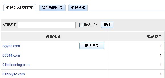 當然,如果你不清楚哪些網站上有你的鏈接,你可以先用外鏈分析工具查詢一下,獲得拒絕鏈接的站長可以看到在鏈接到你的網站的域後面會出現“拒絕鏈接”按鈕: