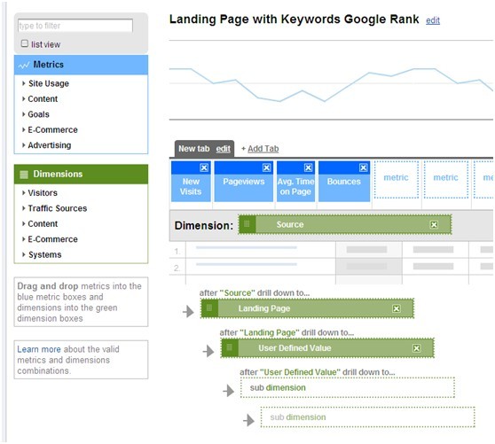 6.為你的報表創建一個名字,然後從左邊的指標和維度列表中拖動我們所需要的模塊,到自定義報表上,設置如圖。
