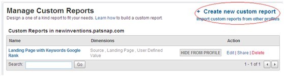 5.打開你網站的報表,左側有一個Custom Reporting-自定義報告,打開Manage Custom Reports,創建一個新的自定義報告。