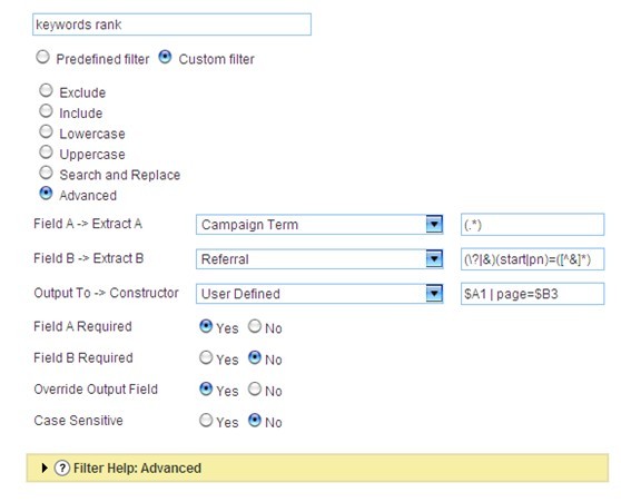 3.為你創建的過濾器設置個名字,然後選擇”custom filter”,然後在下面選擇”Advanced”,下面的下拉菜單設置如圖,3個需要填寫的表單分別為。