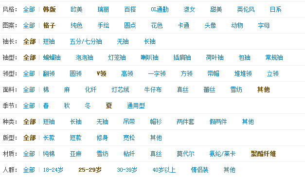 從這一份title可以看出來,淘鞋網一共在類目中設置了6個參數,而在有的網站中,類目設置了可能超過了10個,如當當網的類目設置
