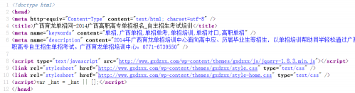 看了上面的幾個優化要點,大家肯定還有疑問。所以,我接下來給大家看看我自己做的現成的案例,大家可以直接看我優化的廣西育龍單招網,網址是 http://www.gxdzxx.com,通過源代碼大家不難發現,我的源代碼已經做到最精簡的程度了,沒有table嵌套,header沒有多余的內容,js和css只有必要的才添加。
