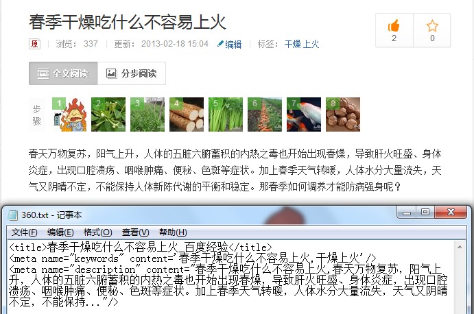 顯然,從上面的代碼中,我們看到百度經驗的頭文件可以說title目錄明確,keywords部分控制在兩個詞,內容上則選取了一個是標題文章,一個是長尾關鍵字。通過查看其它經驗,也是同樣的情況。即標題+標題核心關鍵長尾詞。description部分則選取的是這篇經驗的導讀內容,字數控制在 110內。