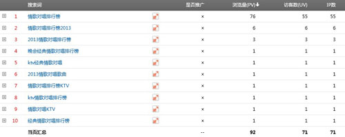 編號1288的頁面因為存在的時間較長,隨著淘K網的權重逐漸提升,這個頁面的權重也同步增加,於是一舉躍進“情歌對唱排行榜”、“情歌對唱排行榜2013”以及“2013情歌對唱排行榜”這些關鍵字的首頁前幾名。由於這些關鍵字本身每天都有不少人搜索,因此造就這個頁面的平穩流量貢獻。
