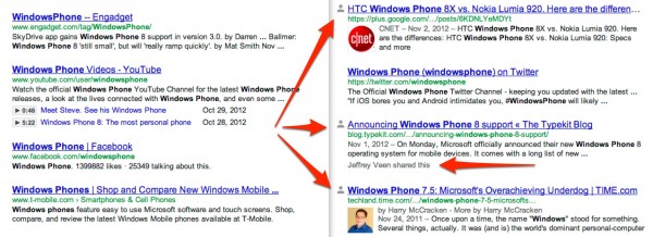 我先關掉了個人化,並搜索了Windows Phone,然後打開個人化,進行了同樣的搜索。結果如下:(左邊的是沒有個人化的結果,右邊的是個人化的)