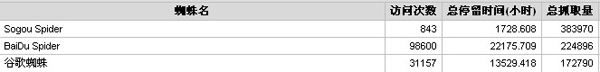 從圖中可以看出,百度蜘蛛的訪問次數和抓取量分別是98600和224896,谷歌蜘蛛的訪問次數和抓取量分別是31157和172790,讓我們用小學數學老師教的算術來算一下平均每個蜘蛛訪問的頁面數,百度蜘蛛:224896/98600=2.28,谷歌蜘蛛:172790 /31157=5.54,可以看出百度的抓取廣度要比谷歌優越一些,而谷歌蜘蛛的抓取深度明顯要高於百度,百度每個蜘蛛平均才看兩個頁面,因此,很多數據量稍大點的網站經常會出現這個情況,谷歌收錄比較多,而百度收錄非常少,針對這一點,做百度收錄量的時候,如果數據量較大,內頁的隨機文章調用這一塊一定要做好,至於如何隨機,自己發揮吧。