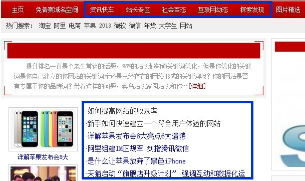 這個網站我一直在准備更改其欄目,因為網站的主要內容是講網站建設以及SEO等方面的知識,發布站長資訊信息的。但是慢慢的,由於內容的需求比較大,而且又都是屬於互聯網行業的,網站的內容就有了行業信息,電子商務,手機行業動態,然後過度到探索發現,社會生活等方面,前階段甚至涉及到軍事類目。很明顯,網站沒有側重性,優化起來也是雜亂無章,因此我在考慮欄目的更改以及網站的調整。由於網站調整對網站排名影響很大,因此我一時半會兒也不敢動。