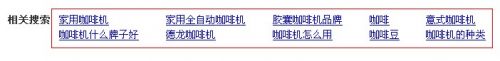 網站的優化首先就得進行關鍵字的分析研究,當在做一個網站的關鍵字分析研究之前首先就得明白所要優化網站的主題,在明白了主題之後就可以根據網站主題關鍵字來進行優化擴展。如:在當前筆者所優化關於銷售“咖啡機”的網站,在筆者明確了該網站主要是銷售咖啡機之時,筆者就會通過“咖啡機”這個主關鍵字來進行優化擴展,此時筆者就會通過關鍵字挖掘工具、站長工具、百度指數、百度下拉框以及百度相關搜索來獲取。如下圖所示咖啡機關鍵字的相關關鍵詞: