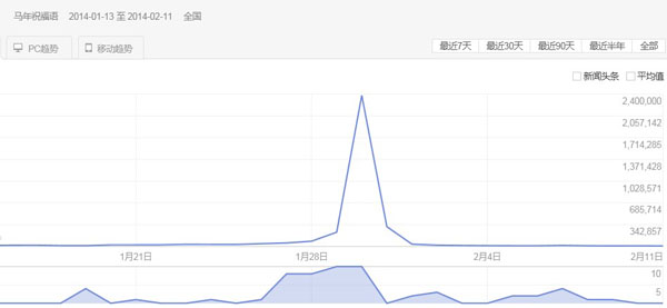如“馬年祝福語”這個關鍵詞就是一個十分典型的例子,在其頂峰時指數高達“407366”(圖1),然而幾天後的今天,它的指數為“13627”(圖2),這個關鍵詞的爆發非常具有典型性,完整地體現一個關鍵詞從誕生到發展再到逐漸低迷的結局(圖3),非常值得我們留意。