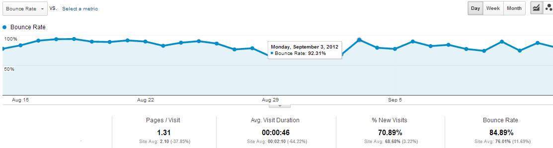 上圖顯示的是一個月來網站的流量。 8月15日之前:這個期間網站流量不錯,他每天發布15到20篇原創文章。由於他的域名時間很久了,積累了一定的權重,所以被搜索引擎賦予了較高的權重,關鍵詞排名都很不錯。但還沒有什麼流量。 從8月15日至8月22日:由於大量原創文章,讓搜索引擎給予了持續的權重,這一期間,從搜索引擎來的流量開始逐漸增大。但是一個很明顯的問題產生了:在這一時期,網站的跳出率非常高,幾乎達到了90%,也就是說,搜索引擎雖然帶來了很多流量,但是訪問者幾乎沒怎麼看網站的內容。他們在網站上停留的時間平均為30秒。