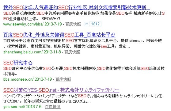 本來是一組非常普通的數據,可頁面中那個引人注意的“日本網站”(見下圖)想必引起了不少seoer的思考。據觀察,差不多有20多天了,這個小日本網站可厲害了,一直排在seo這個搜索詞的首頁,讓我們國人情何以堪,情何以堪啊!