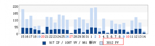 所謂P V就是用戶所浏覽一個網站的頁數,簡單的說就是用戶的浏覽深度。如果一個網站的PV浏覽量很高的話,說明該網站的黏性較好,用戶在該網站的停留時間就越長,同時也直接的反應了該網站對用戶的體驗是比較良好的,既然對用戶的體驗好自然就對搜索引擎的體驗也好,那麼搜索引擎就很可能給予該網站良好的排名和流量。如果PV量較為少的話則說明該網站的跳出率較高,對用戶的體驗不好,那麼此時就應該調整優化策略,增加PV數量。如筆者當前所優化的關於銷售咖啡機的網站每天的PV浏覽量基本為3012PV在同行中比較是很不錯了,如該站的PV數量較為低下的話,筆者就會增加站內頁面優化,做好內部結構的優化來增加 PV量。如下圖所示: