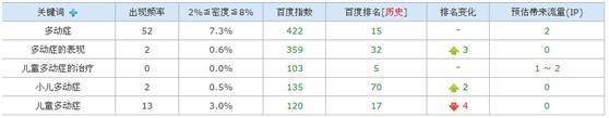 首先一個網站關鍵詞的選取是由多方面決定的:百度指數是其一,它決定了關鍵詞競爭的激烈程度,對那些競爭激烈的關鍵詞,我們要先放放,由多動症這個專題的關鍵詞來看,它的幾個關鍵詞的百度指數比較高,競爭相對激烈,能做到現在這個位置也算不錯的了,當然這也依托於39健康網這個強大的平台。