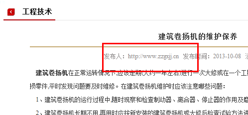 從收錄上來看,很多內頁都有首頁鏈接,可以說很多的內頁都指向首頁,大多數被懲罰都是這個原因,一定不要在內頁裡寫上首頁鏈接並指向首頁,多了的話會直接造成K站、降權,建議更正。內頁裡可以寫這個內頁的地址,這個是可以的,發布人可以填寫公司名稱。