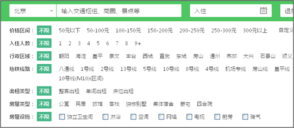 我們通過篩選條件的選取後查詢各自收錄量發現,收錄量隨篩選條件的增加遞減!同時,選擇地鐵站後,title依然為:【50-100元北京朝陽短租 房|50-100元朝陽日租房|50-100元朝陽酒店公寓】,這將導致的情況是篩選頁面長尾關鍵詞布局不同步,在產品不是足夠豐富情況下,生成巨量空白頁面,造成重復內容過多,另外商圈學校頁面為JS控制難以抓 取。