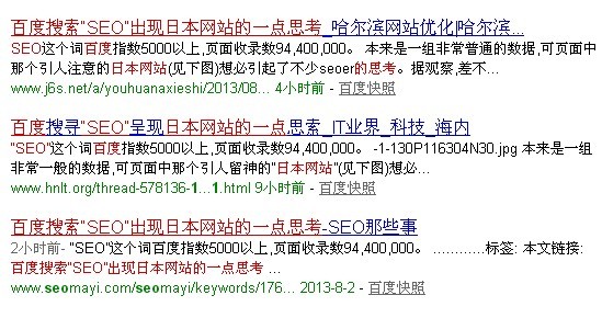 《百度搜索“SEO”出現日本網站的一點思考》這篇文章是小魚兒一直關注seo這個關鍵字排名情況總結的一些思考分享。它的及時性在於捕獲了此時此刻很多人在關注、言論但並未思考分享的東西;它的新穎在於不再僅僅只是圍繞seo基礎知識去擴展討論,而是結果實際知識出發;並且整個文章也是僅僅圍繞標題來發表意見的,讓用戶覺得看完文章是對標題的最好诠釋。