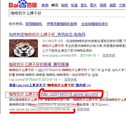 該圖所是為只要通過百度搜索引擎搜索關鍵字“咖啡機什麼牌子好”就會直接將QQ空間展示出來,同時QQ空間的權重很高工具檢測用戶QQ空間權重為7.因此只要優化好了QQ空間也能給予直接的產品以及品牌的推廣,再如下圖為QQ空間做的產品推廣。