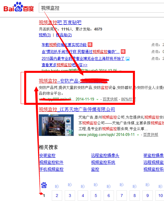 當時就針對這個關鍵字所對應的URL做了幾個同行友情鏈接,錨文字就以“視頻監控”為關鍵字而鏈接就以該關鍵字所對應的URL,又選擇了幾個權重比較好的博客並且這幾個博客也沒有添加rel=“nofollow”標簽。撰寫了幾篇與關鍵字“視頻監控”相關的文章發布到博客中,在文章中選擇一個“視頻監控”關鍵字做上錨文字指向該關鍵字所對應的頁面。堅持每天所更新的博客中只要出現“視頻監控”這個關鍵字就做上錨文字或直接留下對應頁面的URL,這樣持續做了兩周“視頻監控”關鍵字就從100名以外跳躍到了百度搜索首頁如下圖所示: