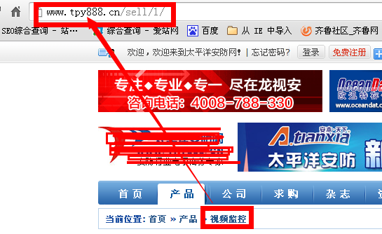 從圖中可見“視頻監控”這個關鍵字的指數在417其在行業中的競爭度也算高的了,當時采用工具查詢時看見該關鍵詞排名在100名以外,我就針對該關鍵詞做了一些優化,其優化的手法也非常簡單就是采用外鏈和錨鏈接來做的。而使用的URL就是網站的一個視頻監控產品分類類目如下圖所示: