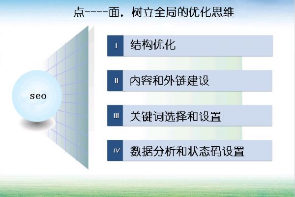 第三,只顧點而忽視面。這一點是非常重要的細節問題,尤其是很多新手僅僅聽到別人說優化就是做內容發外鏈,其實這僅僅是優化中大的兩個方面,我們如果單純從這兩個細節去思索就會不自覺的陷入以偏概全的局面,主要因為優化可能牽扯到細節很多,比如網站結構優化,url優化,三大標簽優化,長尾詞優化,還有一些偽靜態和301等等頁面的設置,這些都是我們要站在全局的角度去看待優化細節的,而不是單單從內容外鏈兩方面分析,但是很多新人恰恰卻的是這些方面的知識,那麼,我們就要在優化之初明白統籌全局的重要性,內容和外鏈僅僅是優化的細節之一,網站前期結構、標簽設置、關鍵詞布局都是我們要考慮的,中後期的數據分析也是我們應該關注的細節,全方位的審視優化細節,這樣才能不斷提升自己優化的大局觀。
