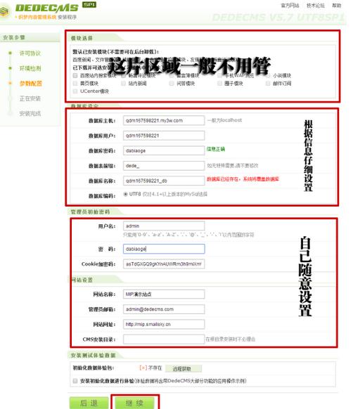 第4步,這裡是最重要的一部分,根據上圖,模版選擇那裡我們基本不需要選擇什麼,開始第二塊,數據庫設定,這裡涉及到幾個概念“數據庫主機”、“數據庫名稱”、“數據庫用戶”、“數據庫密碼”、“數據表前綴”、“數據庫編碼”。請自己將空間商或者自己創建的數據庫信息對照著填寫完整。第三塊,管理員帳號密碼,自行填寫第四塊,網站設置這裡,網站名稱改成你自己的,其他一般不需要動,尤其是Cookie加密碼這個盡量不要動,其他的在後台都可以改的不要勾選初始化數據進行體驗,直接點擊繼續,就安裝完成了!我附上我的安裝參數給大家看一下。