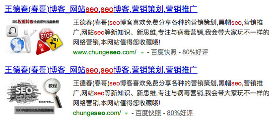 這種情況已經5年多了,本來沒有多想。最近又注意了一下的原因是,在百度搜索“SEO”時,有個相對新的網站爬到第一頁了。這位春哥的博客在7月中旬開始有個奇怪的現象,在百度結果中同時顯示了帶www和不帶www的兩個版本,有時候還並排在一起: