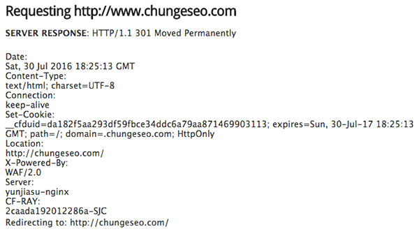 看一下帶www的版本的頁面頭信息可以知道,博主做了301到不帶www的版本: