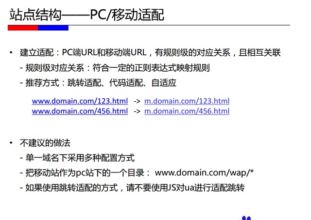 一個中心:網站一定要有移動適配,三個基本點:1.不要做多種配置方式,2.不要把移動端作為PC的一個目錄,3.如果使用跳轉適配方式,不要用JS進行跳轉。