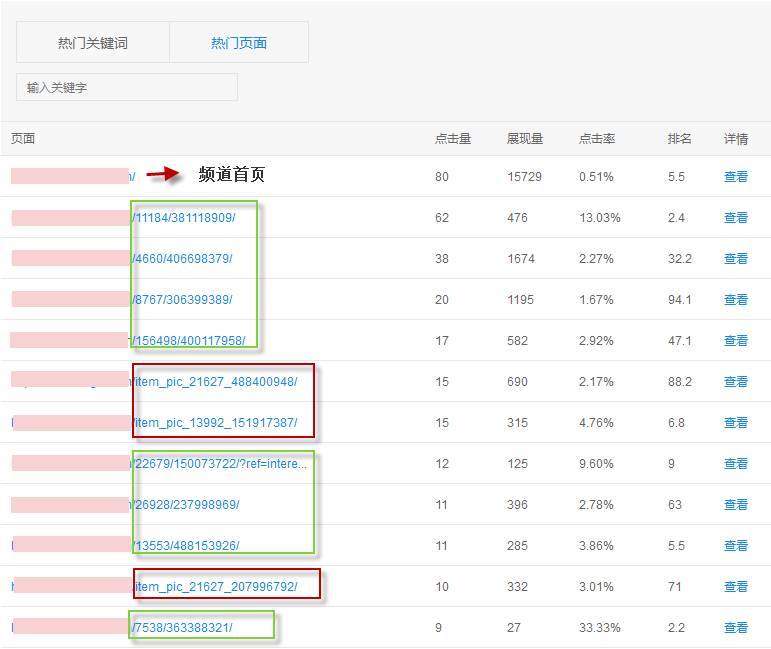 上圖是某C2C電商網站的商品二級域名在百度站長平台“關鍵詞與流量”功能項“熱門頁面”的單日數據截圖,其中,紅框內URL代表商品大圖頁,綠框內URL代表商品詳情頁:商品詳情頁。透過這張圖,我們可以分析推導出當前SEO策略的缺陷以及後續SEO重點開展方向。