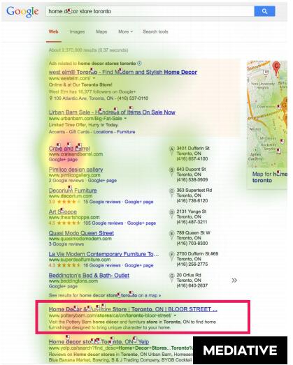 在2014年,Mediative 發表了一篇眼動跟蹤研究報告。這篇報告詳細闡述了在過去十年中,谷歌搜索引擎結果頁面的變化,以及用戶搜索習慣是如何適應這些變化的。我們發現: